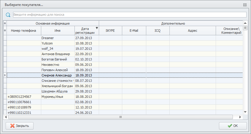 Тут можно найти и выбрать покупателя по любым данным, не только по номеру телефона.