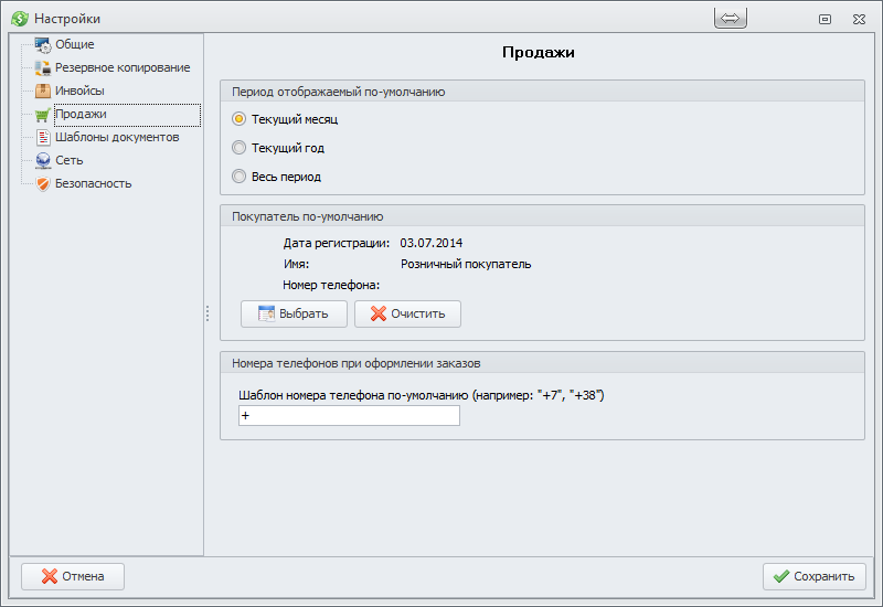 "Продажи" и нажав кнопку
