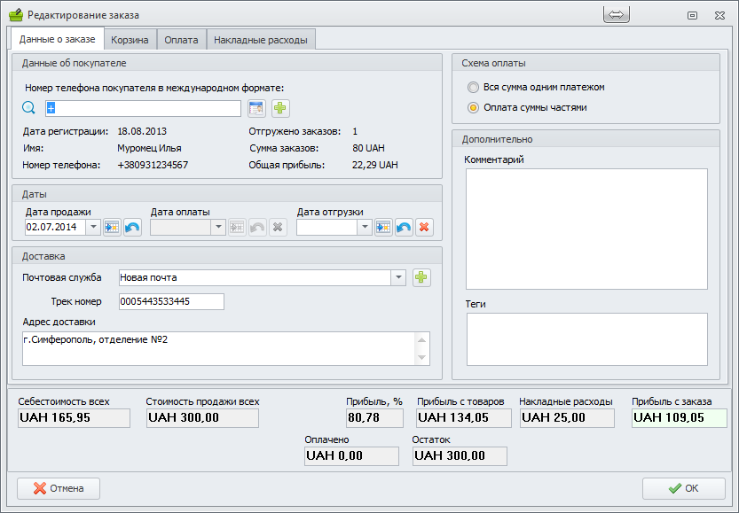 Почтовая служба, которой будет отправлен заказ. Если же это заказ, который не подлежит отправке, например покупатель лично забираете его у вас, то в качестве почтовой службы можете указать например "При встрече" или "Самовывоз". Возле данного поля имеется кнопка
