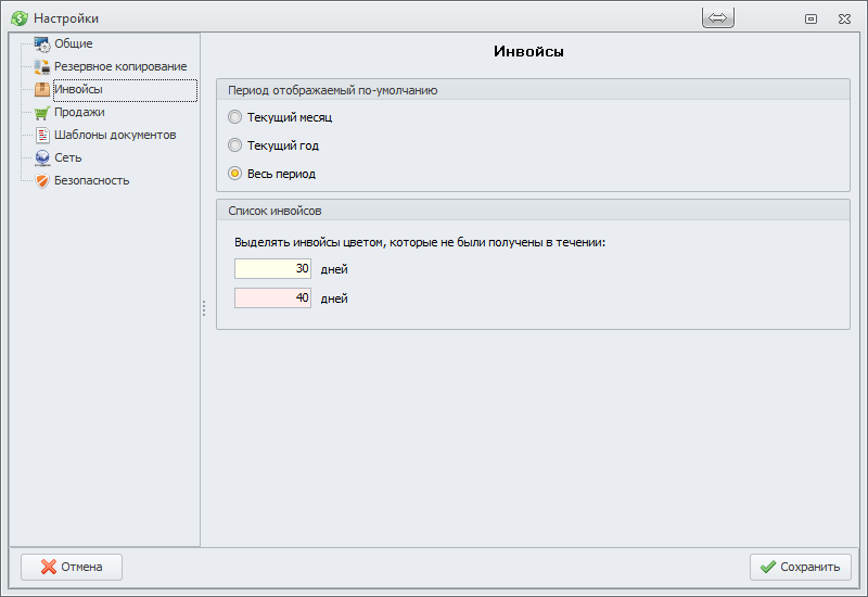 списке инвойсов желтым и красным цветом. Промежуток времени 30 и 40 установленный по умолчанию можно изменить тут.