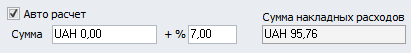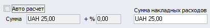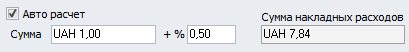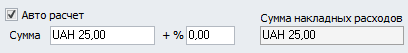 Для накладных расходов заказа доступен автоматический расчет суммы. Включив его как показано выше, накладные расходы будут рассчитываться как "сумма + процент от суммы заказа", при изменении суммы заказа, суммы таких расходов будут автоматически пересчитываться.