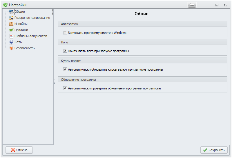 Раздел настроек "Общие" позволяет установить следующие опции: