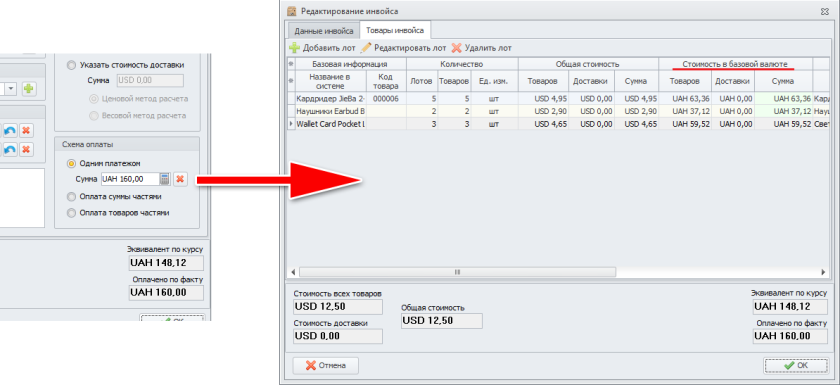 базовой валюте и "раскидывается" на все товары инвойса пропорционально их стоимость в валюте инвойса. Если данная сумма не указана, т.е. инвойс еще не оплачен то, себестоимость в базовой валюте будет рассчитана исходя из текущего курса.