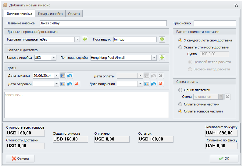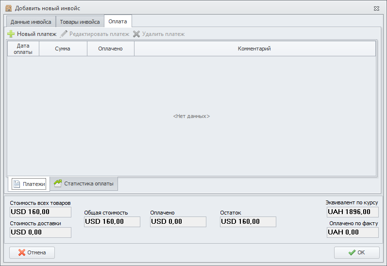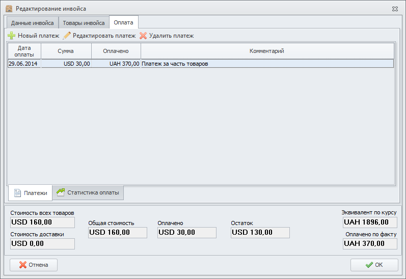Выбрав данную схему оплаты, на форме редактирования инвойса появится вкладка "Оплата", а так же дополнительные поля "Оплачено" и "Остаток".