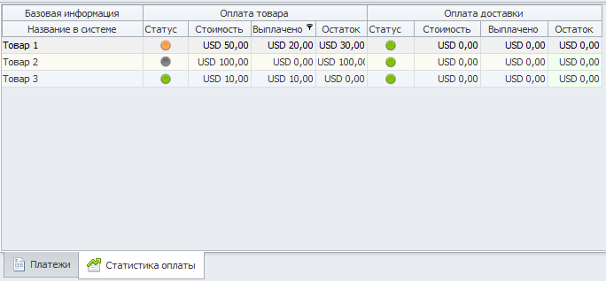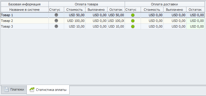 Тут так же есть две вкладки "Платежи" и "Статистика оплаты". В платежах отображается перечь выплат, в статистике оплаты отображается подробная информация о задолженности по каждому товару. Пока ничего не оплачено статистика выглядит так: