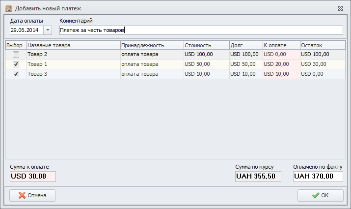 Указываем суммы, которые платим за товары. Товара 1 - 20 USD, Товара 3 - 10 USD. За товар 2 не платим ничего. Итого 30 USD. Так же указываем сумму оплаченную по факту в базовой валюте. Для подтверждения нажимаем