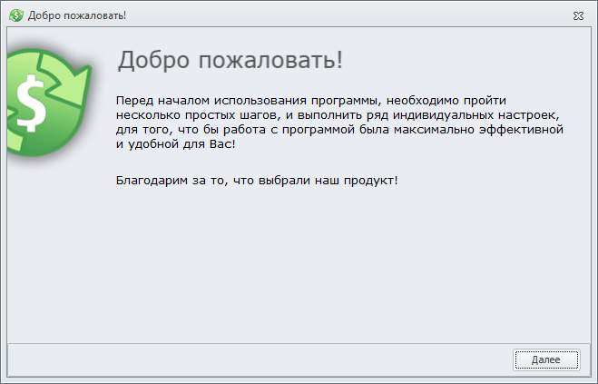 При первом запуске приложения будет запущен мастер настройки, который поможет задать начальную конфигурация программы и базы данных.