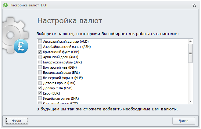 На данном этапе следует выбрать только основыные валюты, в будущем вы всегда будете иметь возможность дополнить этот список. После того как выбор сделан, нажмите кнопку