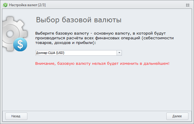 Следующим шагом будет выбор базовой валюты. Базовая валюта - это основаная валюта, в которой будут производится расчеты по продаже товаров, в нее будет пересчитывать стоимость купленных товаров из других валют, а так же в базовой валюте будет рассчитываться прибыль и отображаться все показатели в отчетах.