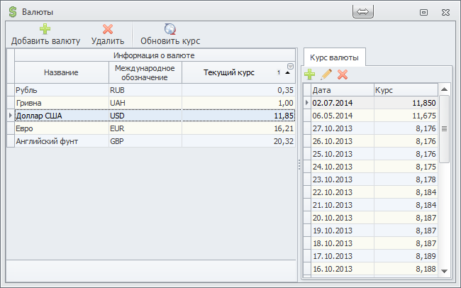 первом запуске программы, но вы всегда можете расширить этот список. Кроме того, вы можете просмотреть историю изменения курсов валют и обновить курсы валют вручную либо через Интернет.