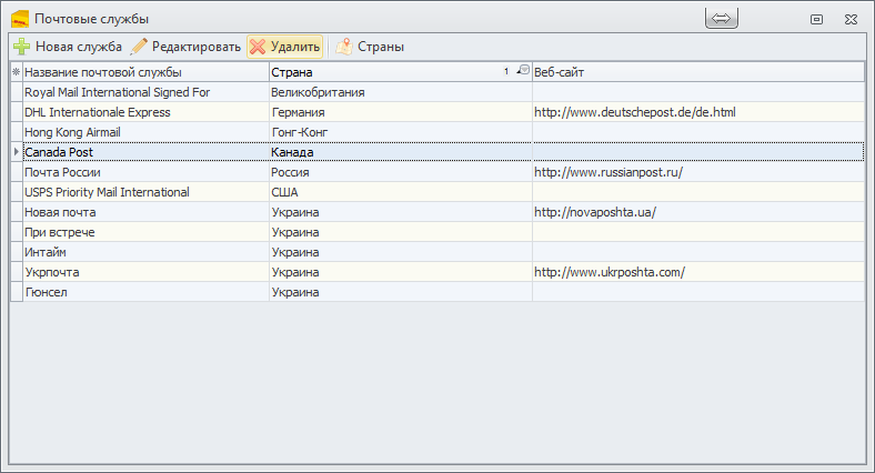 Следует отметить, что нет необходимости регистрировать почтовые службы каждый раз на этой форме. Везде, где требуется выбор почтовой службы существуют кнопка