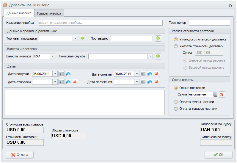 После чего появится форма добавления инвойса, показанная ниже.