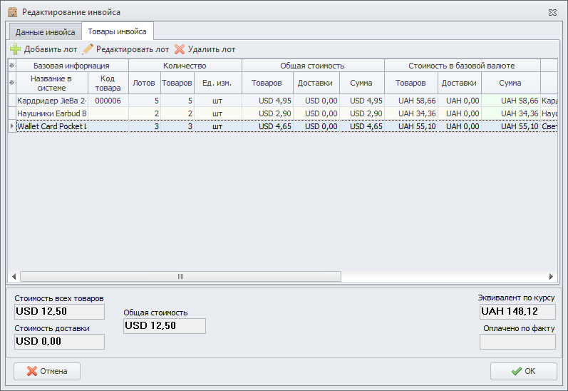 Тут показан список товаров инвойса, а так же имеются кнопки для добавления, редактирования и удаления товаров (лотов).