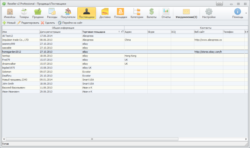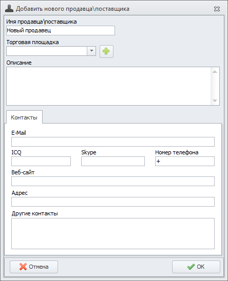 Обязательными полями являются лишь Имя продавца\поставщика и Торговая площадка. Торговую площадку можно выбрать из выпадающего списка