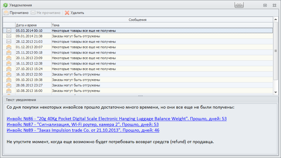 настройках программы). Что бы вы не пропустили момент, когда еще не поздно запросить у продавца возмещение средств за не полученный товар.